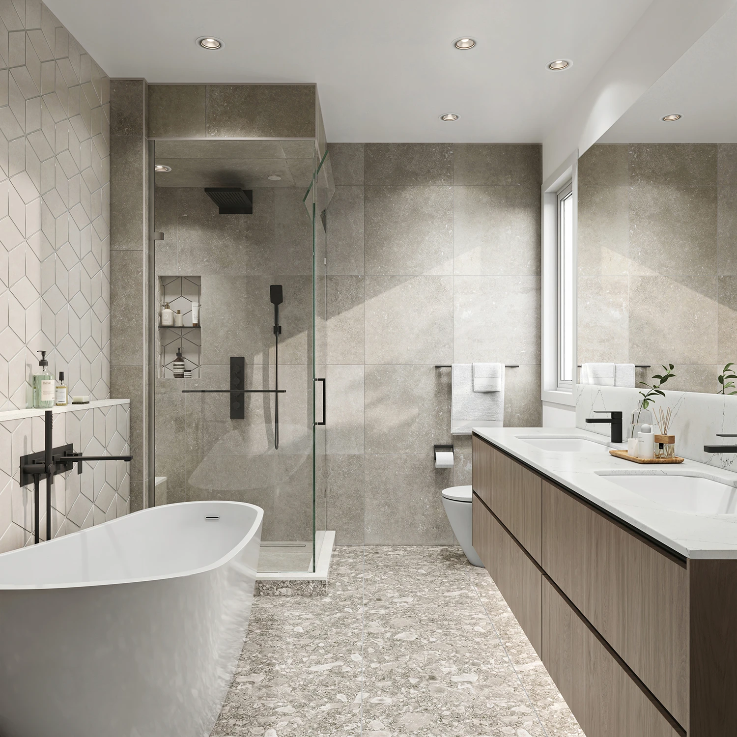At id+b studio, forever homes have a special place in our hearts. The new owners were a young couple who had upsized from a townhouse. They were looking to transform this residence into the ideal home in which to watch their two children grow up, and in which to grow old together. With this in mind, we worked closely with the family to design spaces that would fit their lifestyle today but also remain relevant well into forever, planning out the closet, kitchen cabinetry, and even adding a clever and functional hidden pantry. We used high quality materials and finishes to ensure longevity, and timeless hexagonal tiles in the kids’ bathroom.